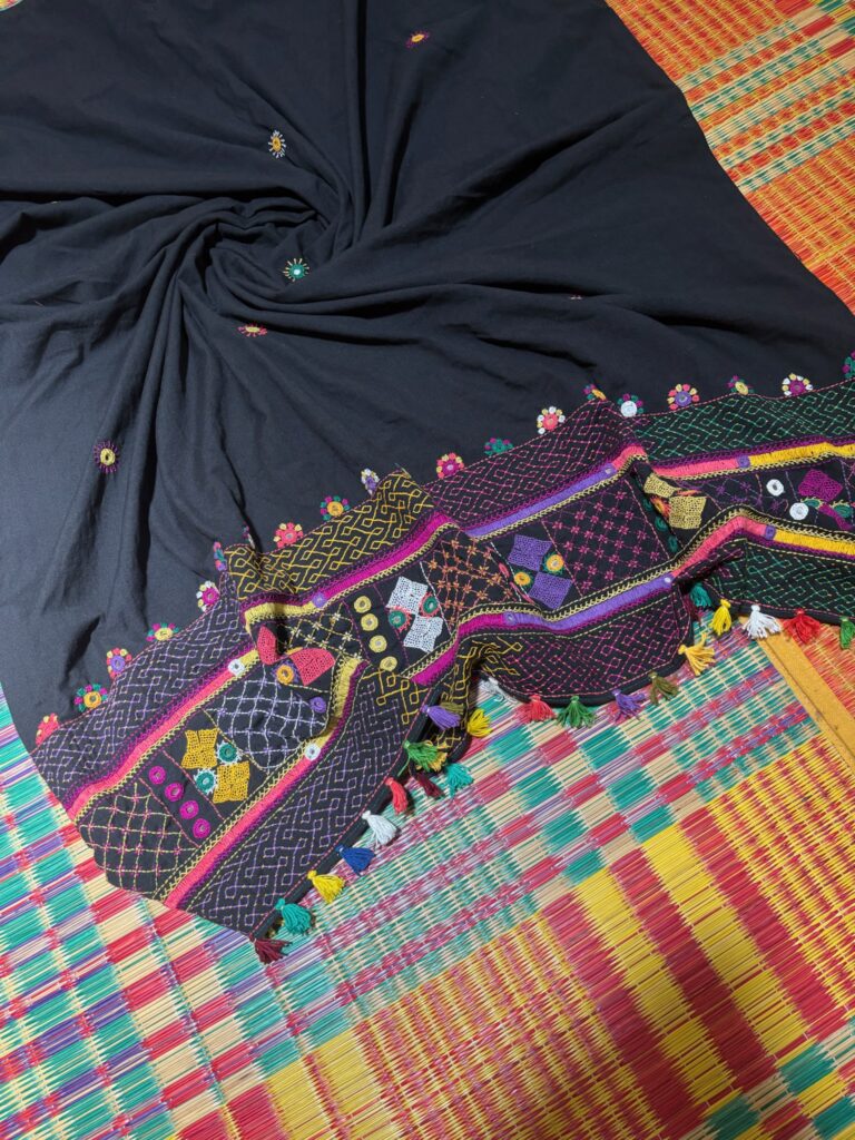 Each motif carries meaning — from auspicious symbols to daily life inspirations. What makes this art form even more unique is that it’s still crafted by hand in rural workshops in Sandur, preserving the authenticity and rhythm of tribal life. No two pieces are identical; every saree, kurta fabric, dupatta or patch tells its own story.